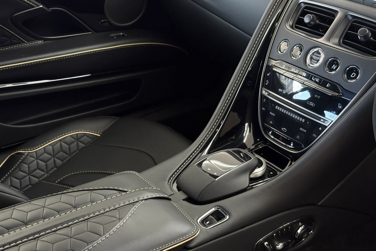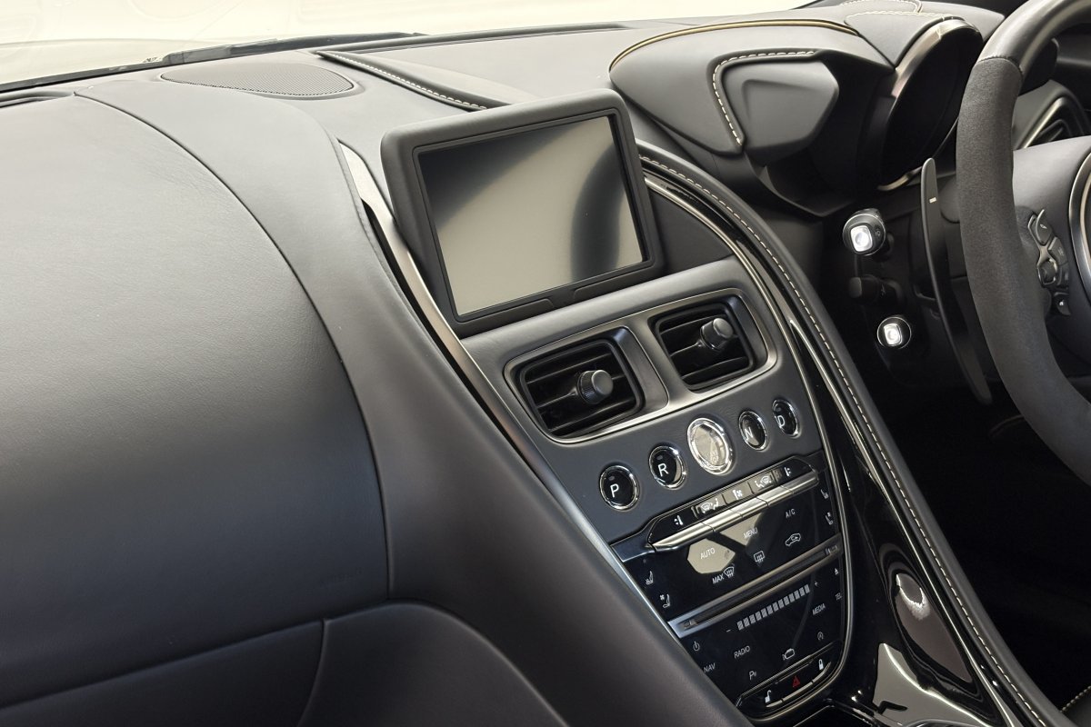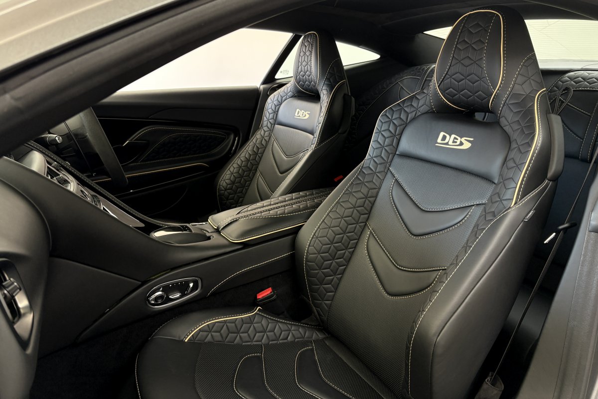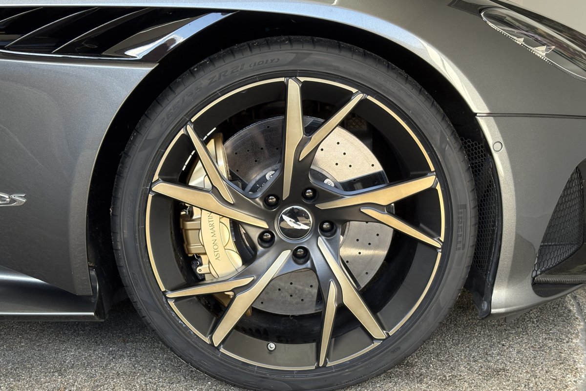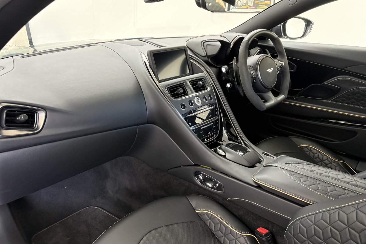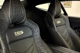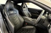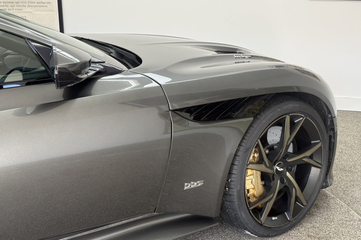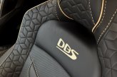 The front of the DBS features a new front bumper, with a larger centre grille compared to the DB11, for improved engine cooling, along with two air extractors on the sides to cool the brakes and two vents on the hood that aid in the engine cooling process. The 5.2-litre twin-turbocharged V12 engine, which is cast and manufactured at Grainger & Worrall in the United Kingdom before being shipped to the Aston Martin engine plant in Cologne for assembly, is rated at 725 PS (533 kW; 715 hp) at 6,500 rpm and 900 N⋅m (664 lb⋅ft) of torque from 1,800–5,000 rpm.[8] In order to optimise the centre of gravity and weight distribution, the engine has been positioned as low and as far back in the chassis as possible.