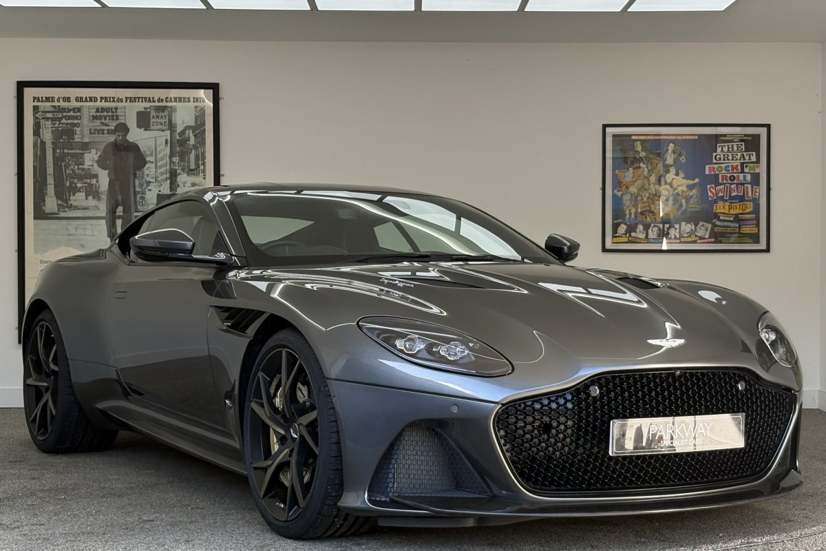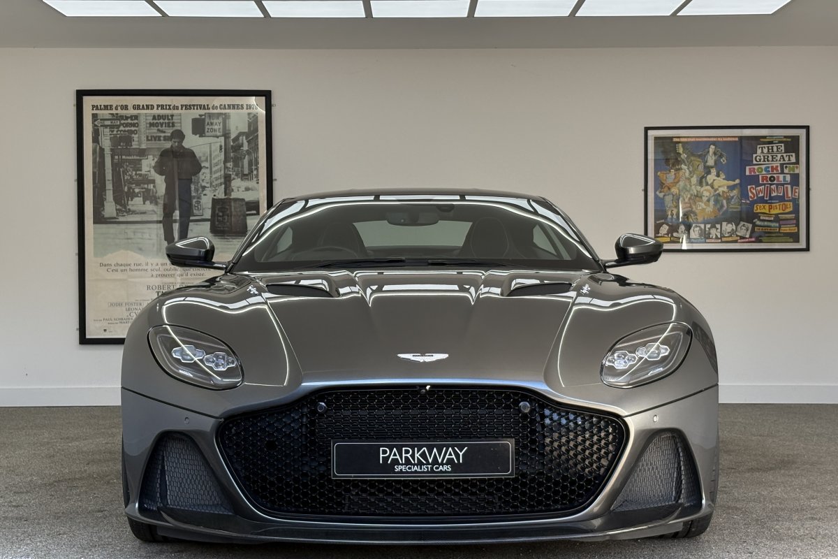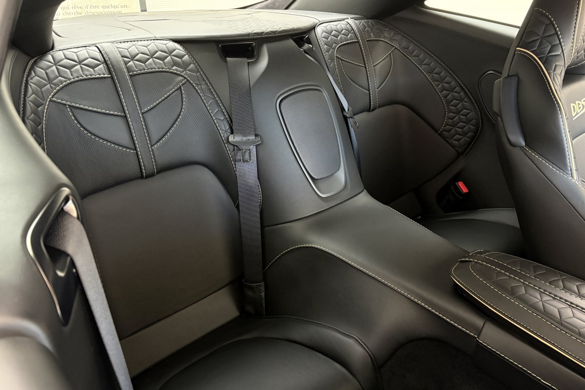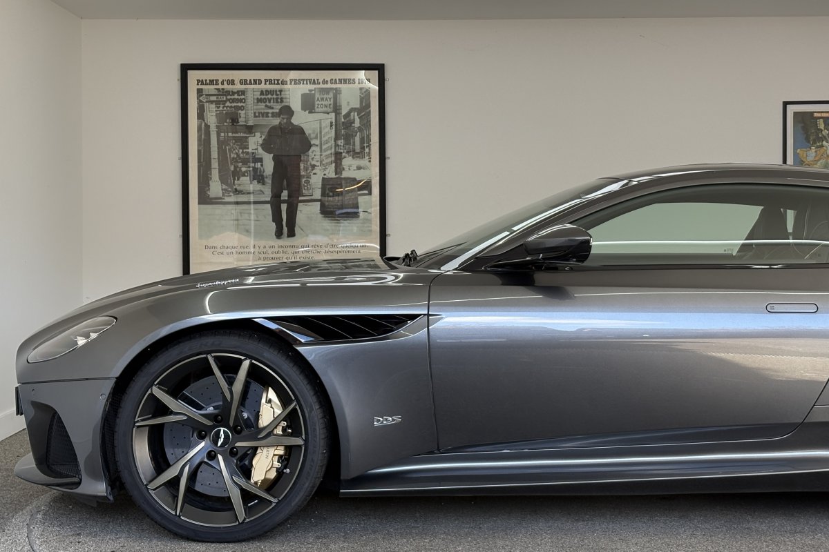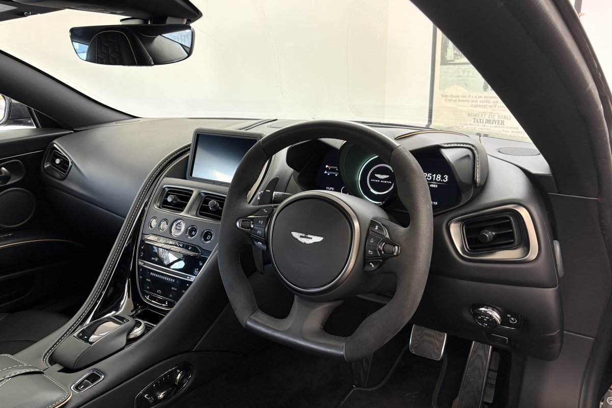 The front of the DBS features a new front bumper, with a larger centre grille compared to the DB11, for improved engine cooling, along with two air extractors on the sides to cool the brakes and two vents on the hood that aid in the engine cooling process. The 5.2-litre twin-turbocharged V12 engine, which is cast and manufactured at Grainger & Worrall in the United Kingdom before being shipped to the Aston Martin engine plant in Cologne for assembly, is rated at 725 PS (533 kW; 715 hp) at 6,500 rpm and 900 N⋅m (664 lb⋅ft) of torque from 1,800–5,000 rpm.[8] In order to optimise the centre of gravity and weight distribution, the engine has been positioned as low and as far back in the chassis as possible.