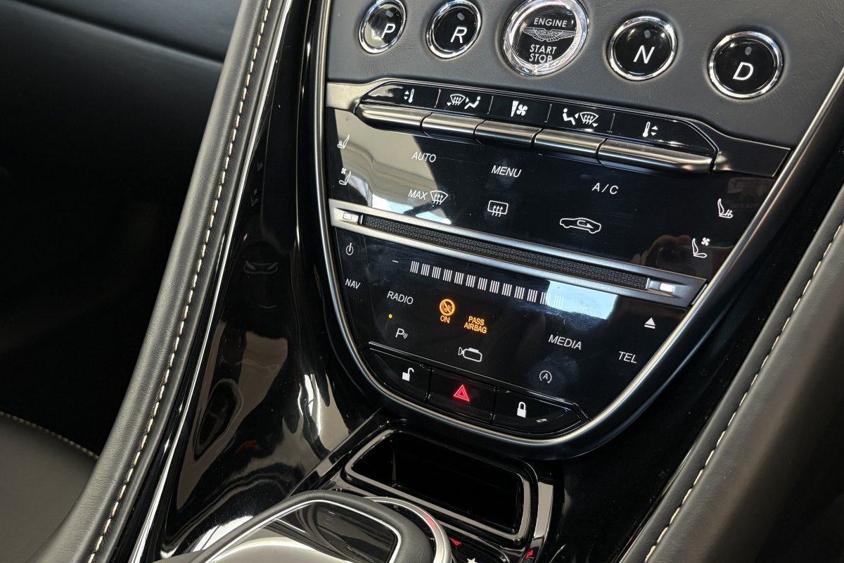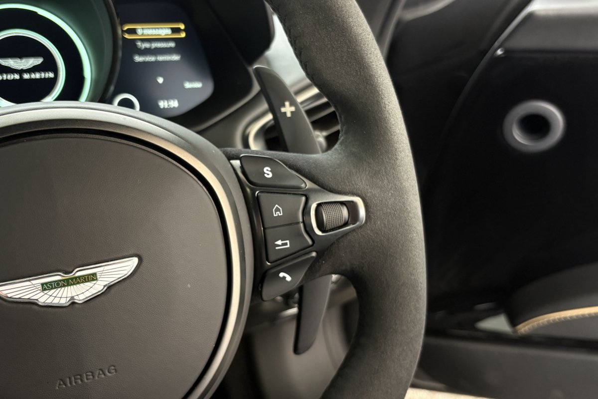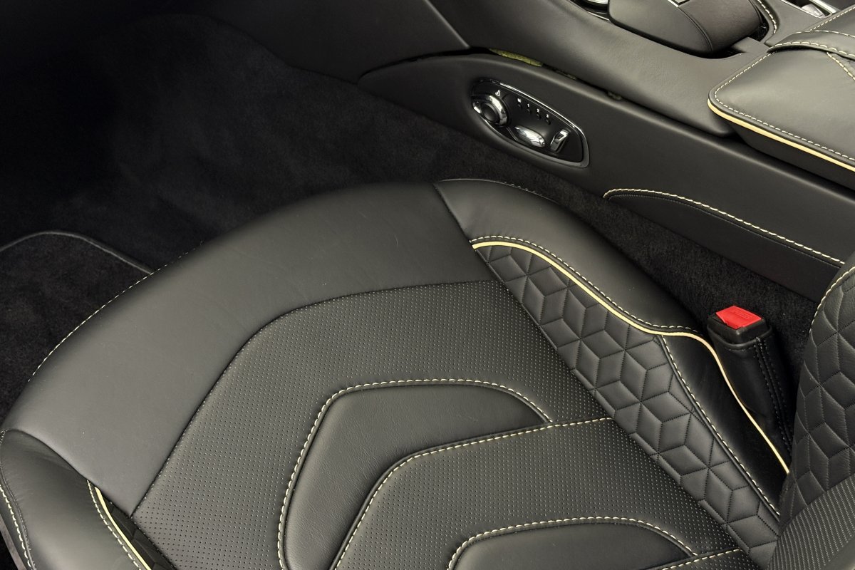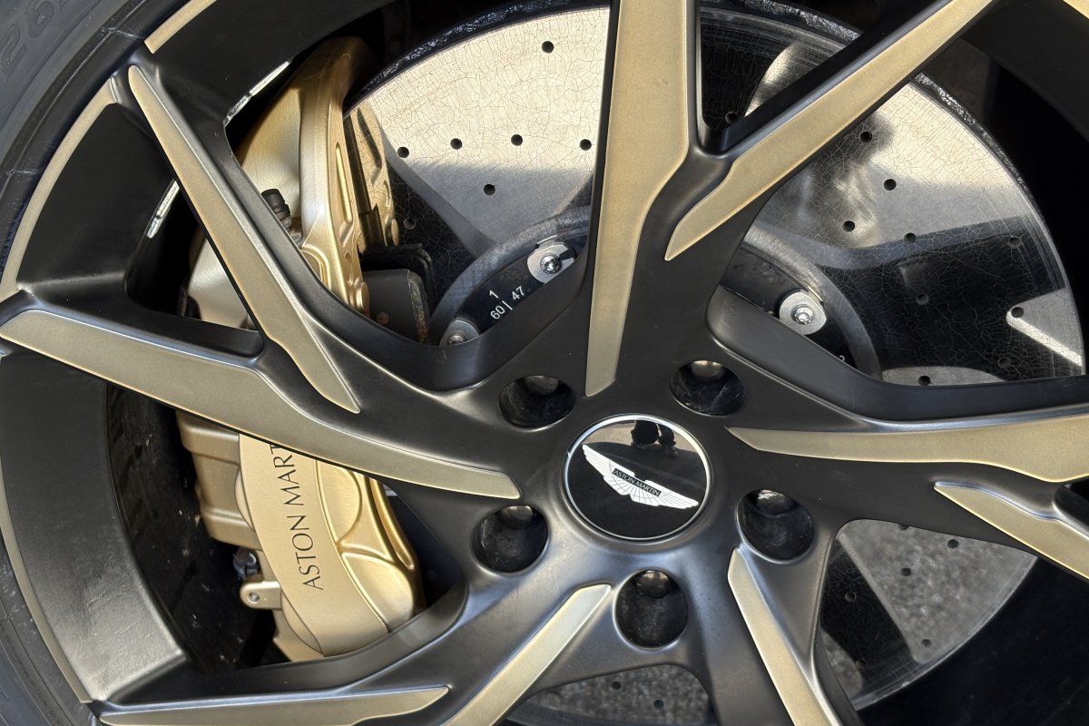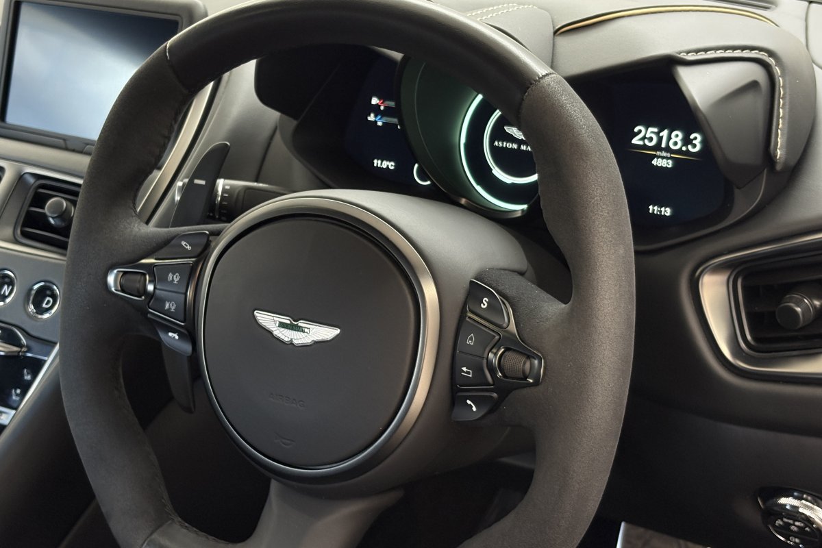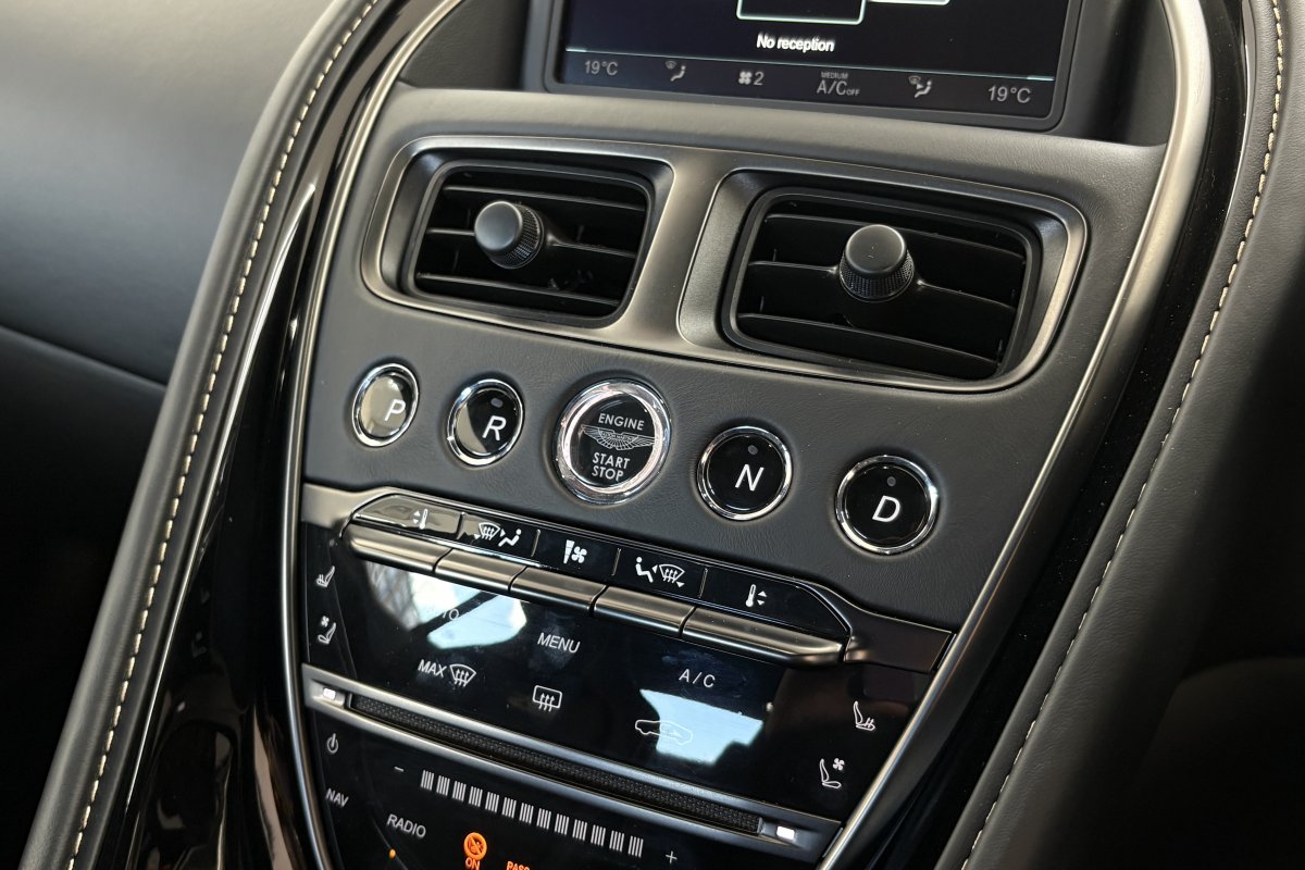 The front of the DBS features a new front bumper, with a larger centre grille compared to the DB11, for improved engine cooling, along with two air extractors on the sides to cool the brakes and two vents on the hood that aid in the engine cooling process. The 5.2-litre twin-turbocharged V12 engine, which is cast and manufactured at Grainger & Worrall in the United Kingdom before being shipped to the Aston Martin engine plant in Cologne for assembly, is rated at 725 PS (533 kW; 715 hp) at 6,500 rpm and 900 N⋅m (664 lb⋅ft) of torque from 1,800–5,000 rpm.[8] In order to optimise the centre of gravity and weight distribution, the engine has been positioned as low and as far back in the chassis as possible.