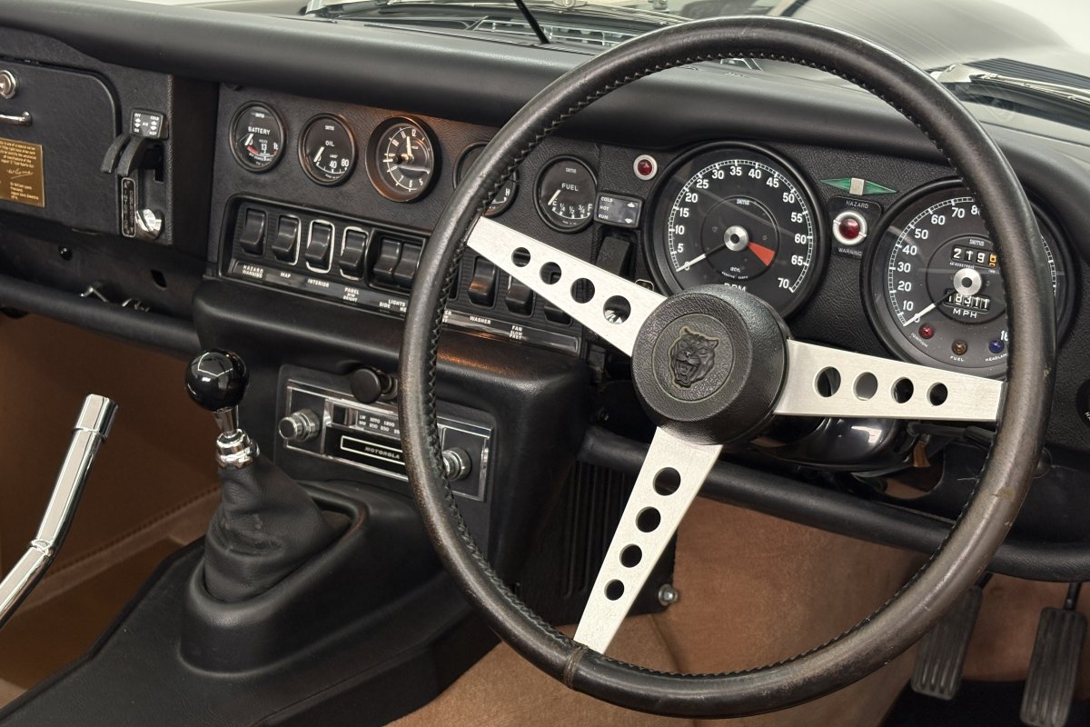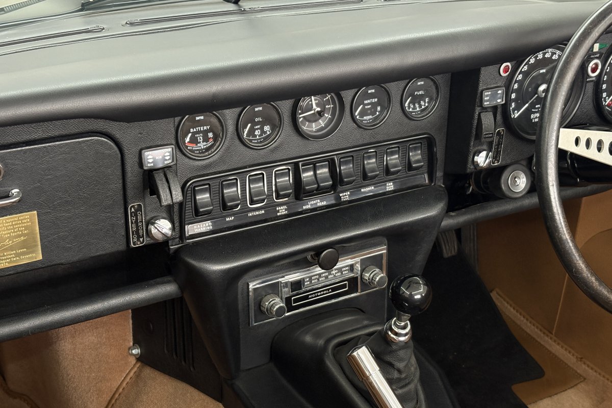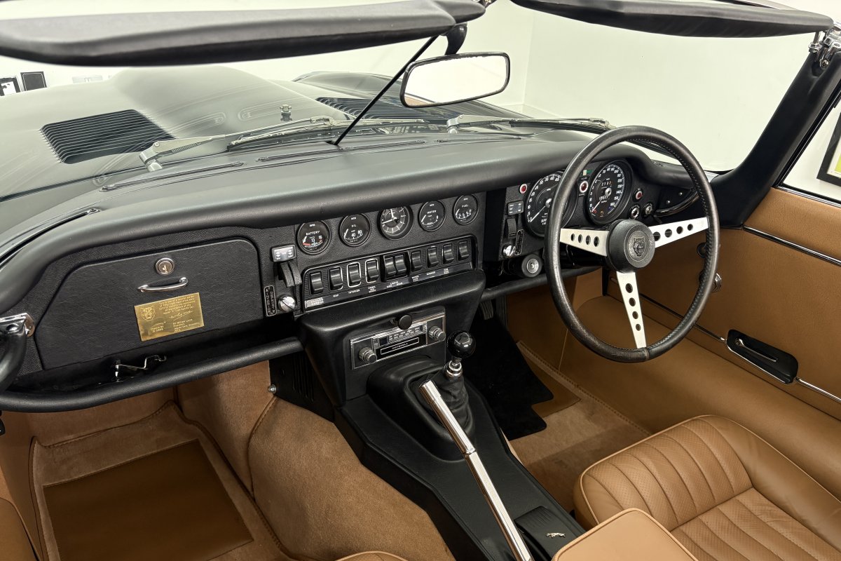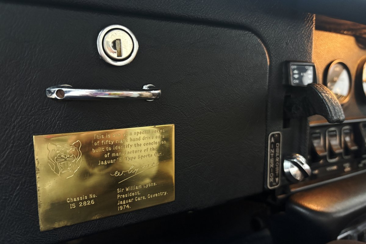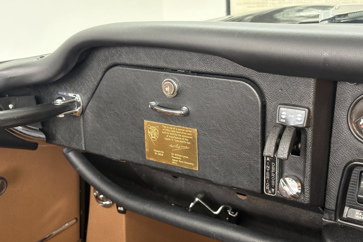 The final 50 RHD Roadsters were built as a final edition to formally mark the end of the E-Type production. These were known as the Commemorative and each were finished in Black Paint and Cinnamon leather apart from one green car made specially for a Jaguar collector. There was a choice of manual and automatic, 19 automatic and 31 manuals were produced. The first of the 50th Commemoratives was built on the 15th May 1974 and E-Type production offically closed with the last car one month later on the 12th June. A bronze plaque adorns each example bearing the chassis number and William Lyons signature....